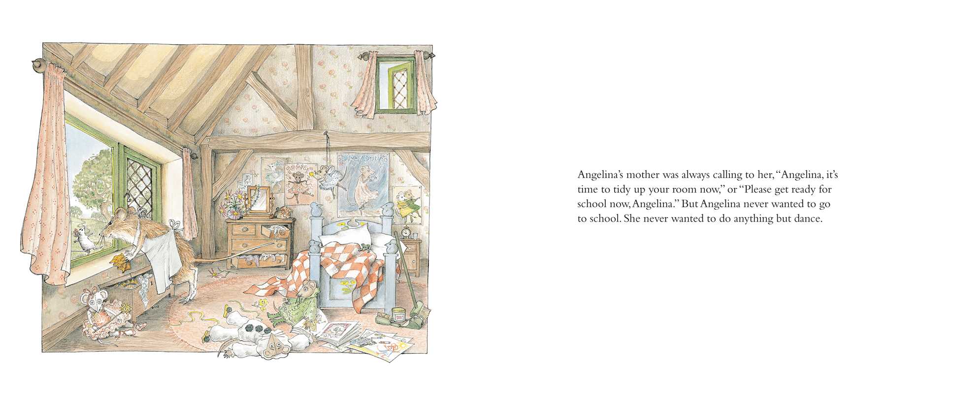 Angelina is a pretty little mouse who wants nothing more than to be a ballerina. She dances all the time—at home, at school, even in her dreams! In fact, she’s so busy dancing that she forgets all about the other things she’s supposed to do, like cleaning her room and joining her family for breakfast!