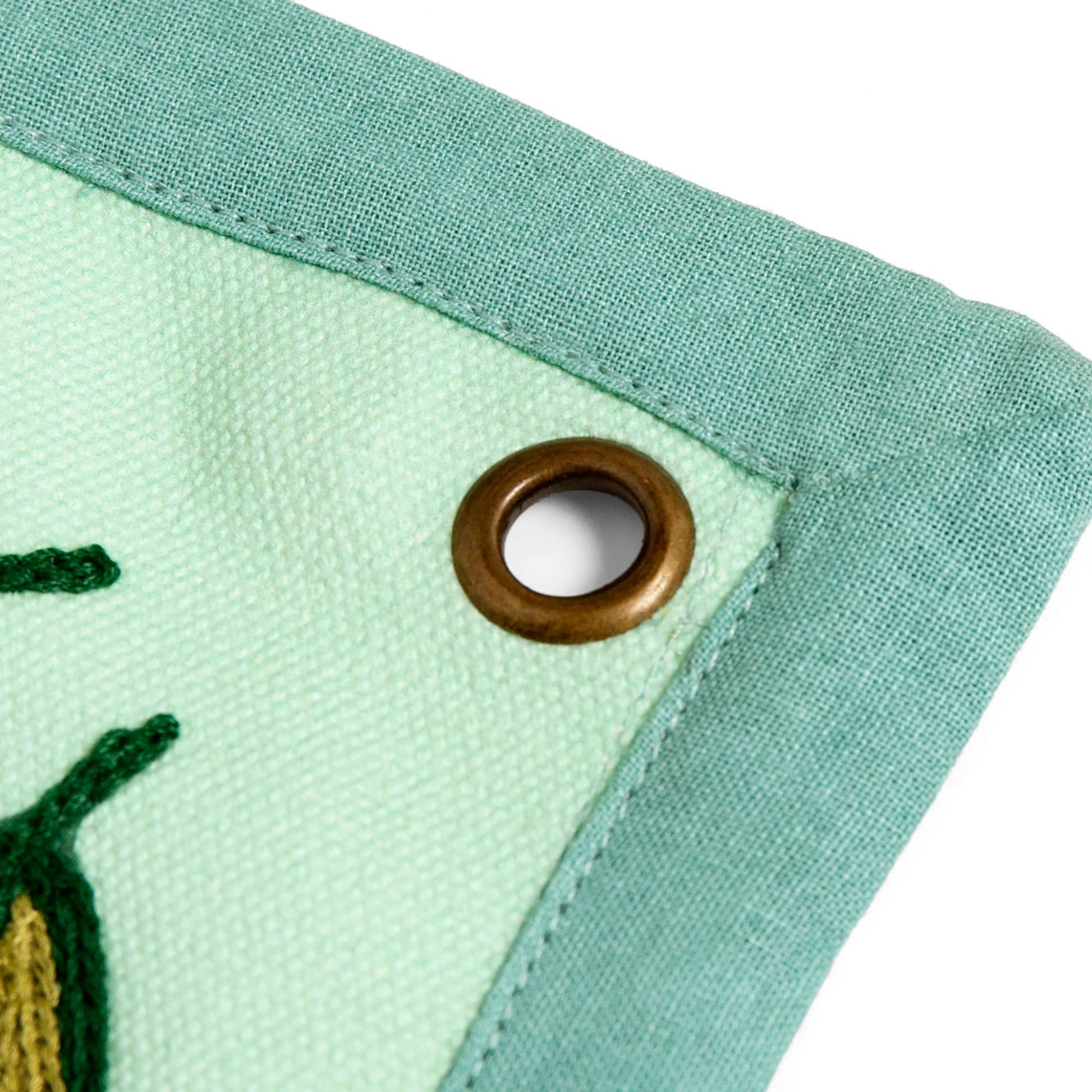 • Features: Canvas banner, chain stitched embroidery, brass grommets, and a canvas hem edge