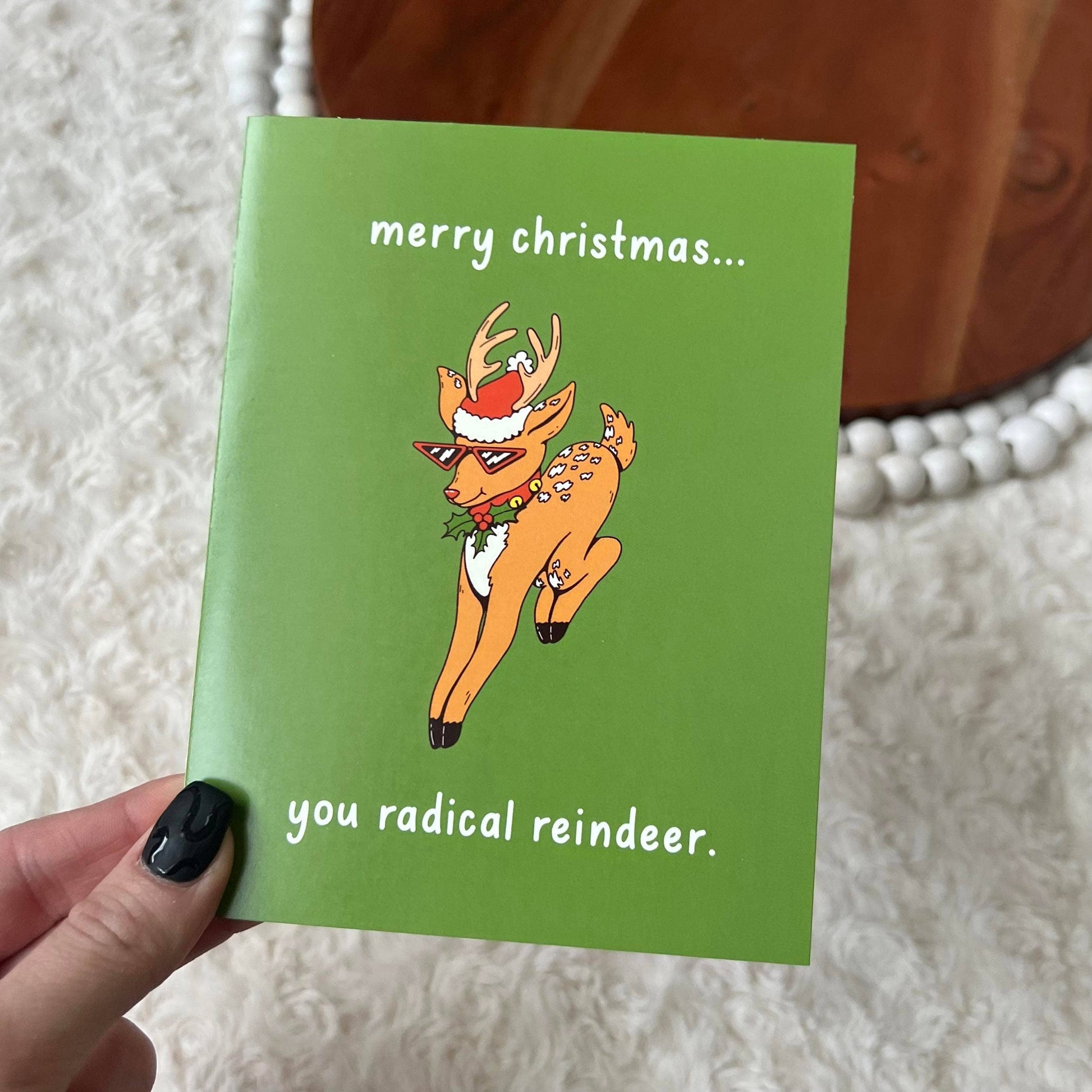 "Merry Christmas You Radical Reindeer" funny christmas card. The perfect holiday / xmas card for that cool person in your life with a sense of humor.