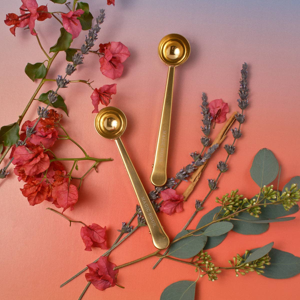 Introducing the Magic Hour Tea Scoop, a golden marvel designed to enhance your tea rituals effortlessly. With its sleek design and ideal size, this scoop ensures the perfect amount of tea leaves for a pot of your favorite brew. What sets it apart is the attached clip, allowing you to conveniently secure it onto your tea pouches. Crafted for both style and functionality, let this elegant scoop be your trusted companion in every tea moment, making each sip a magical experience.