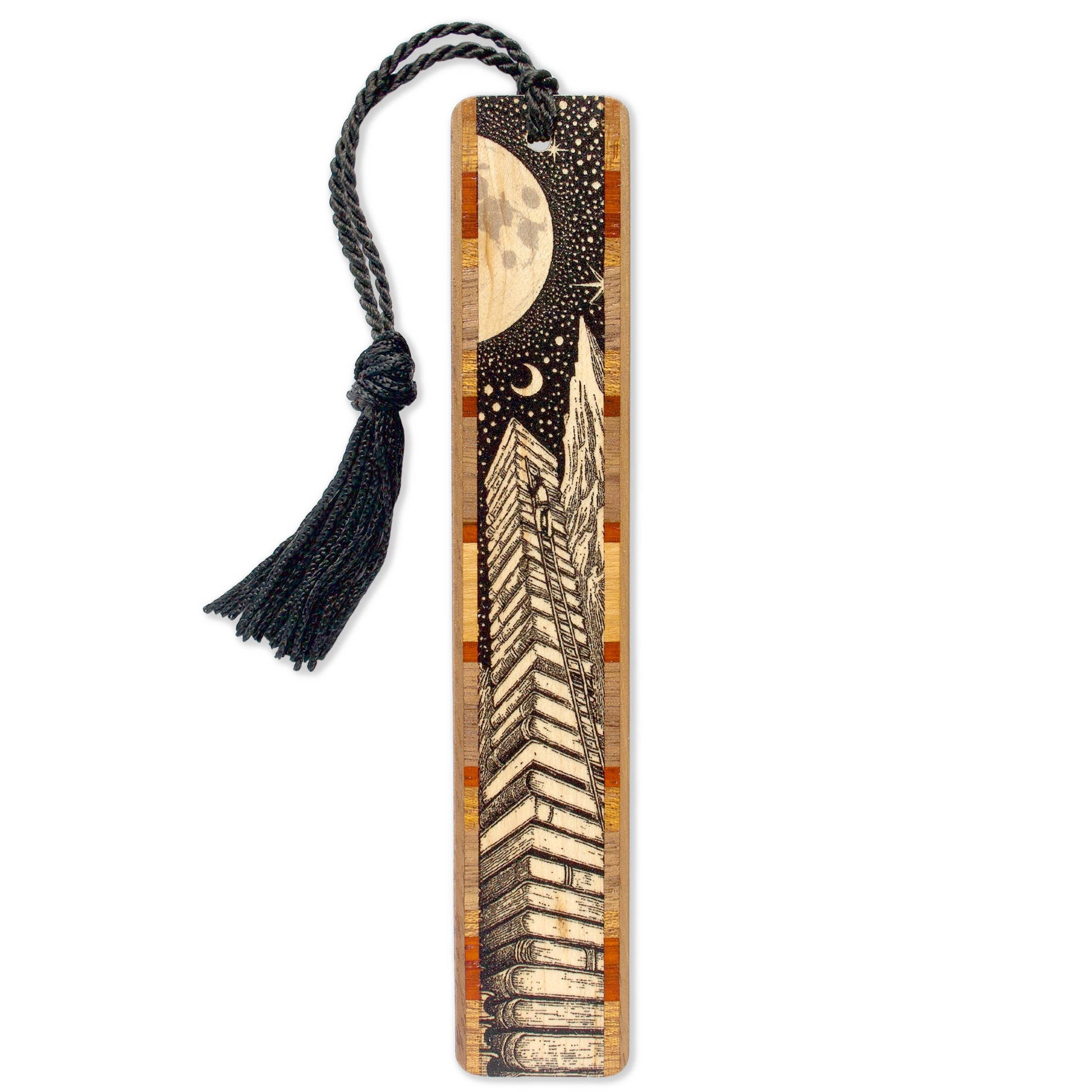 Our Summit of Stories Wooden Bookmark, features a whimsical book climber scaling a towering stack of books beneath a starry sky. A tribute to literary explorers, this design celebrates the journey of knowledge—one book at a time.